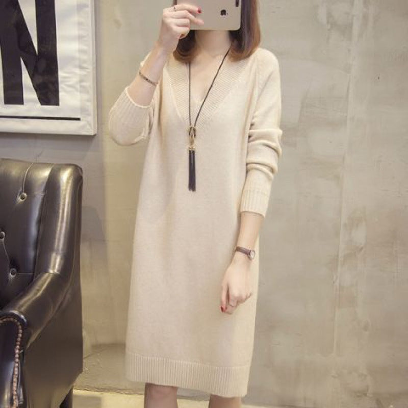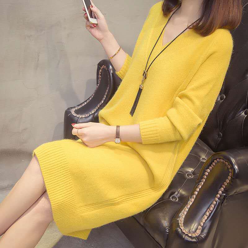 ✨【S-4XL】Nova jesensko/zimska pletena midi haljina za veće veličine s V-izrezom -4158924