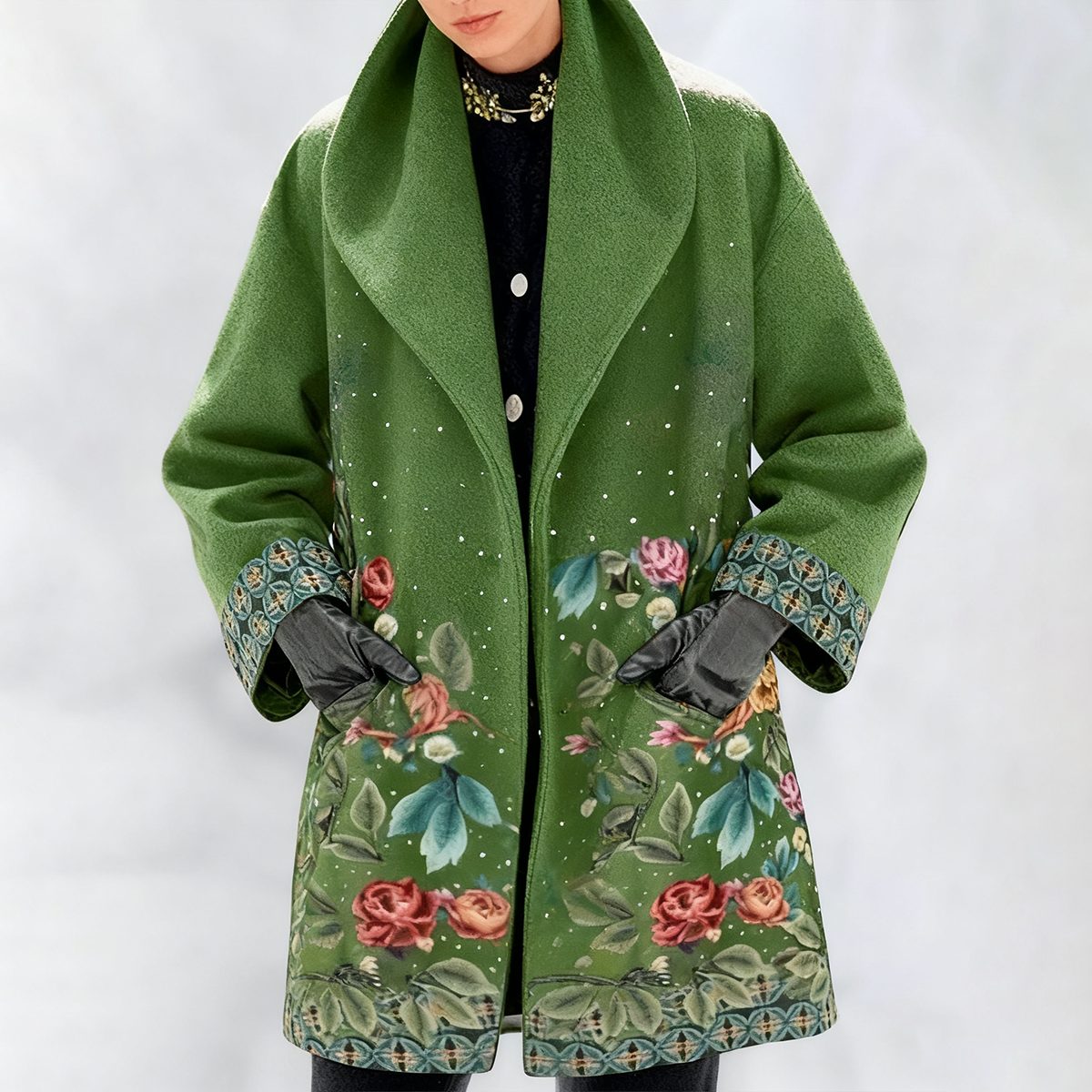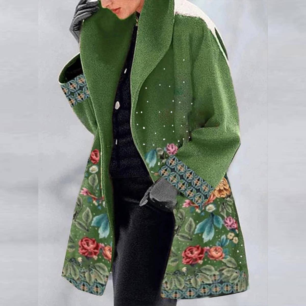🌿【S-5XL】Wąski wełniany płaszcz z zielonym kołnierzem i klapami z nadrukiem europejskim i amerykańskim